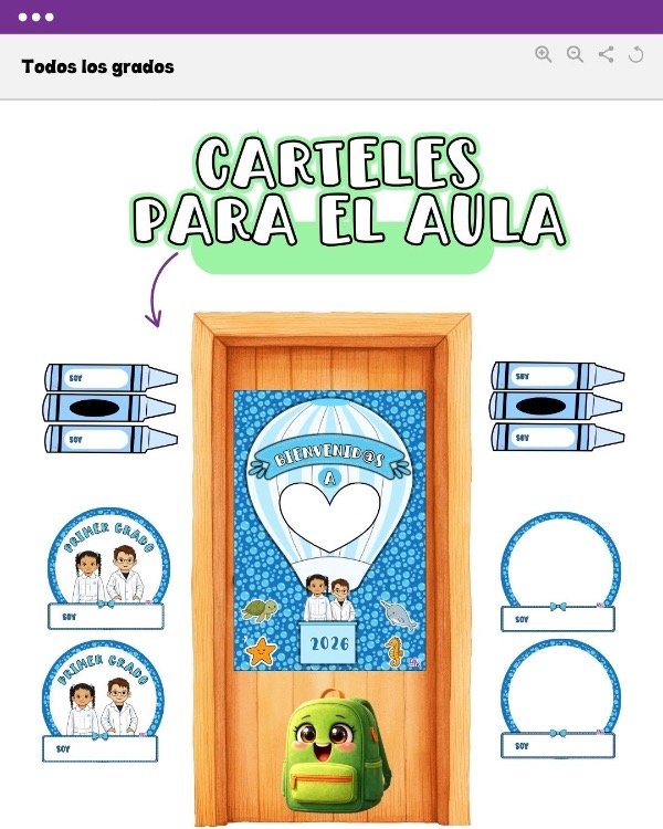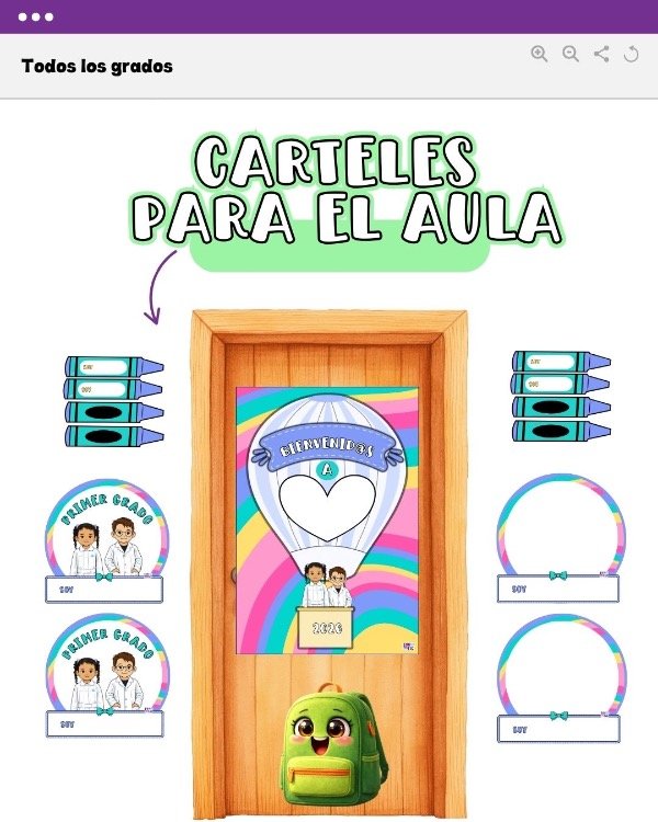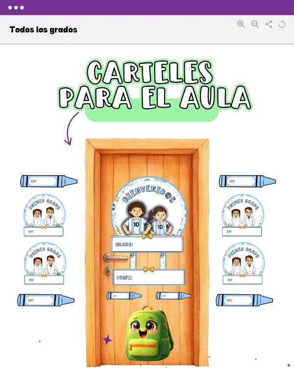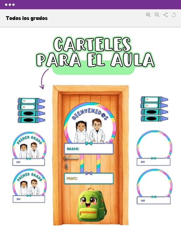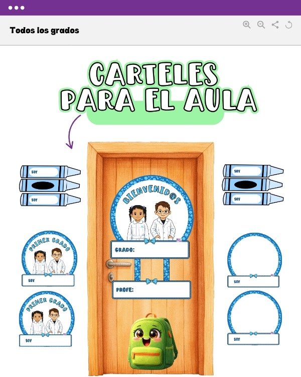 Este PDF contiene varios modelos de carteles para la puerta del aula, en diferentes tamaños, con diseños listos para imprimir y una selección de ilustraciones decorativas que permiten personalizar el espacio y crear un ambiente cálido, motivador y visualmente atractivo. Diferentes tamaños.(2 x hoja a4, 4 por hoja a4)